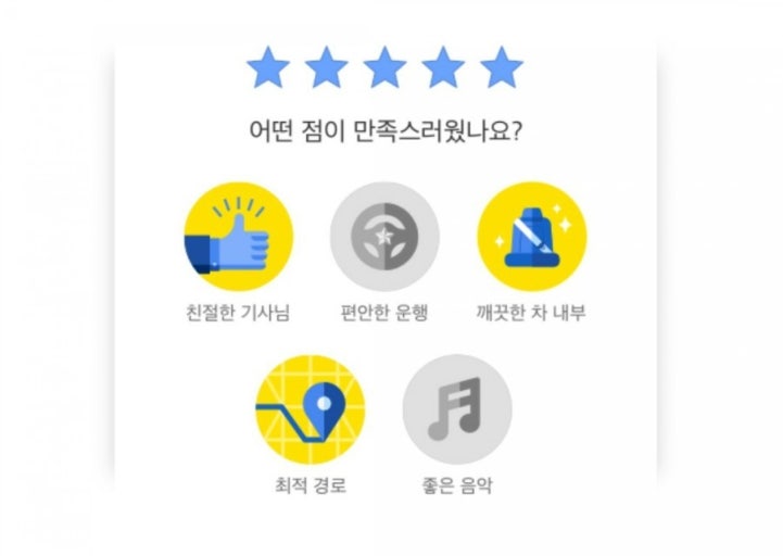택시운행이 끝나고 난 다음에 손님이 기사를 평가하는 방식은 위에 나온 것 처럼 5개 분야에서 별 5개를 주는 방식으로 하고 있습니다.
