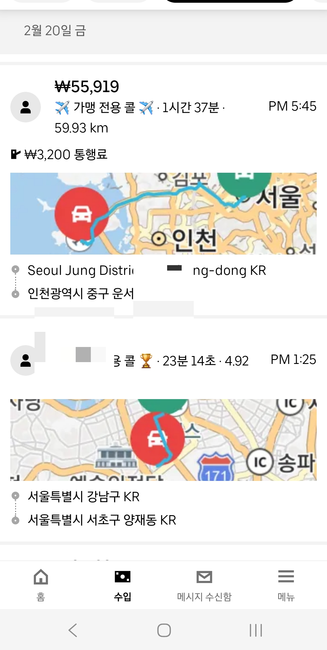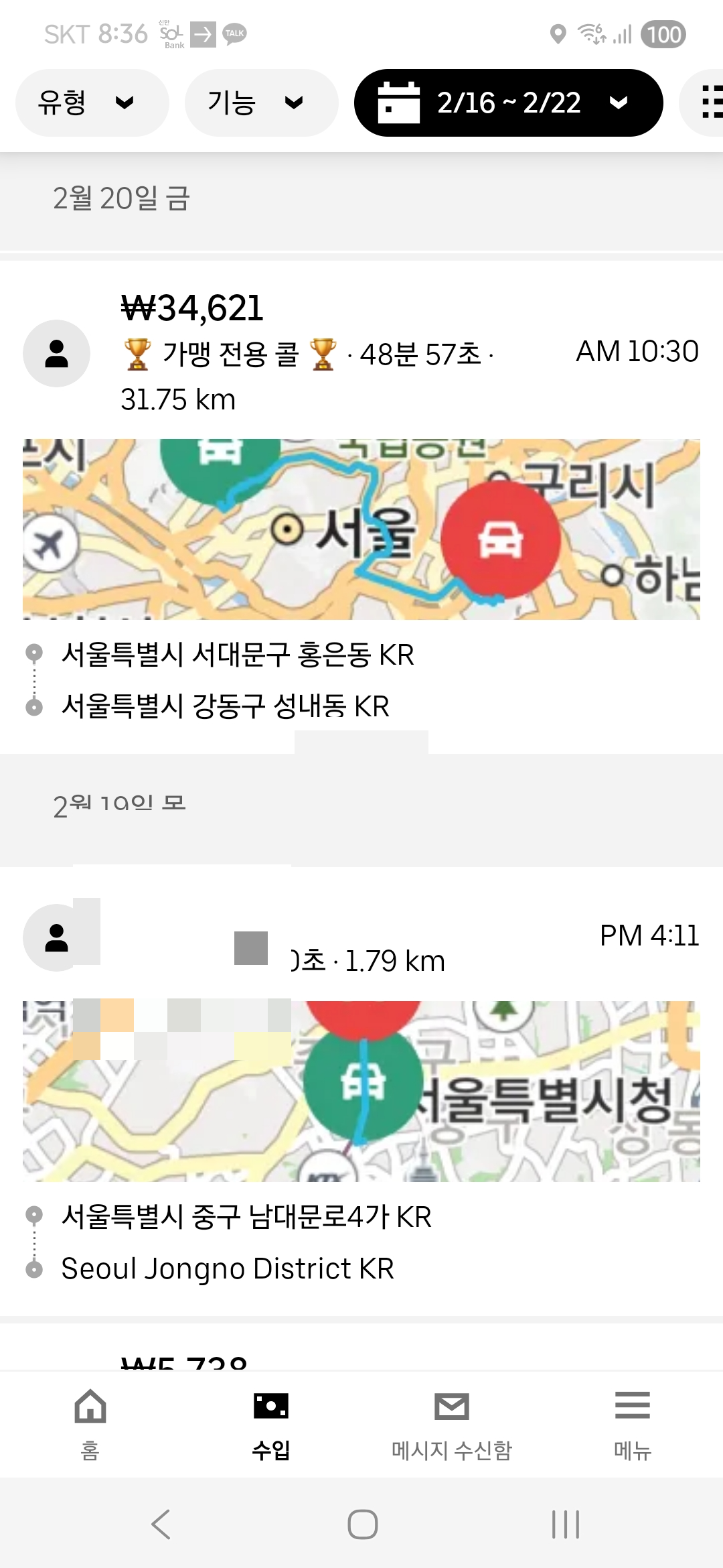 그런데 어제 오전 망원동을 지나는데 우버 예약콜이 뜨더라구요. 요즘 설날 연휴기간이라 손님이 별로 없는 탓에 예약 창을 열어보니 강동구 성내동과 인천공항 2건이 있어서 이거 좋다 하면서 눌렀습니다.