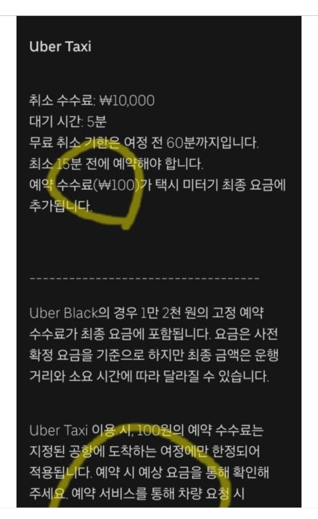 예약 수수료도 시내는 5,000원이고 인천공항, 김포공항은 100원입니다. 저는 무조건 10,000원으로 알고 있었는데 말이죠. 우버가 외국인과 관광객 점유율을 높이기 위해 100원만 받고 있는 것 같은데 기사들이 지나치게 손해보는 기분이 드네요.
