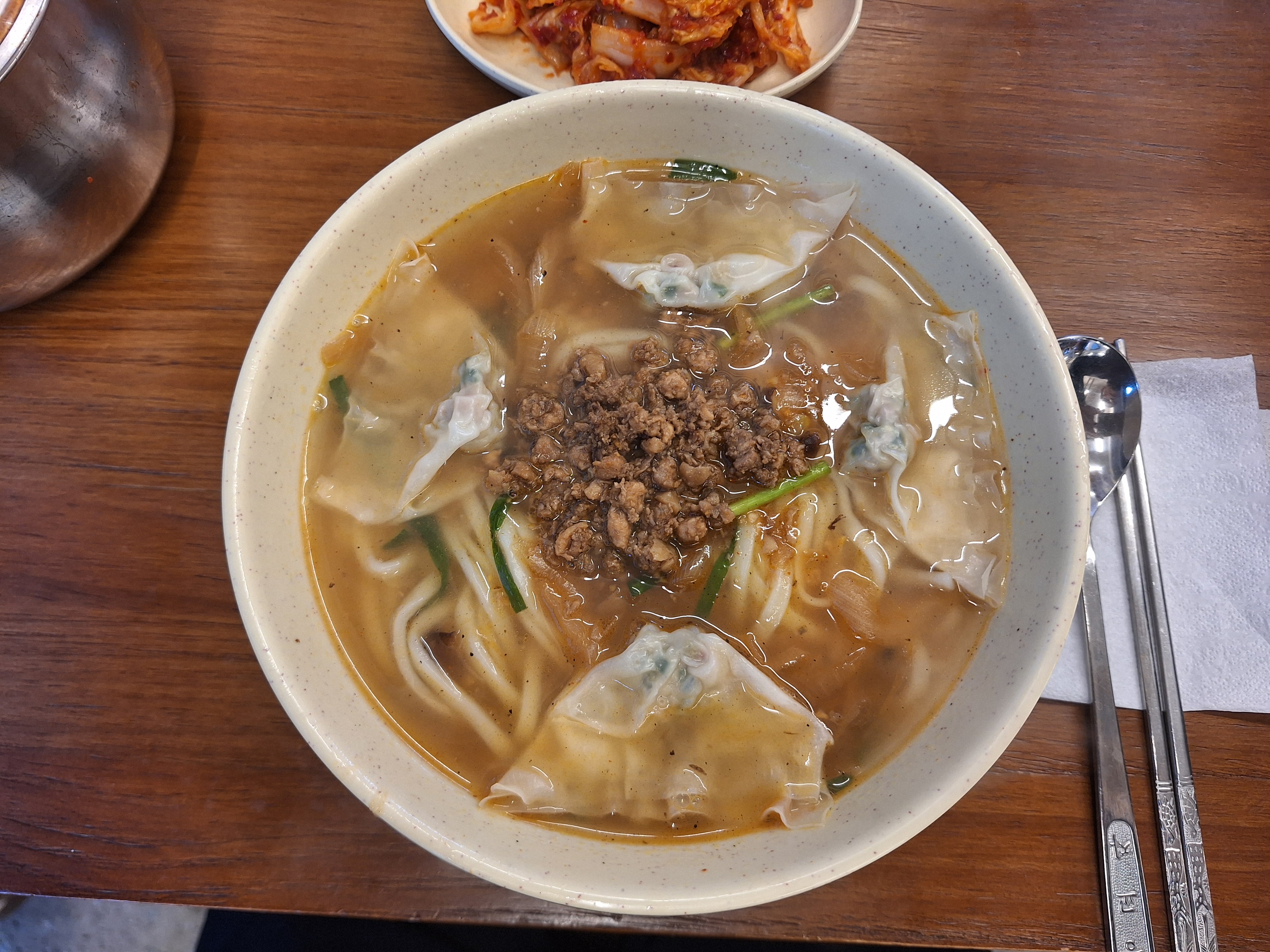 한 그릇에 12,000원. 두께가 엷은 만두가 4개 섞여 있고, 면발은 생각보다 가늘고 부드러웠습니다. 다른 곳은 국물을 닭고기로 우려낸 것 같던데 여기는 소고기인지 돼지고기인지 잘 모르겠지만 아무튼 닭고기는 아닌 듯.